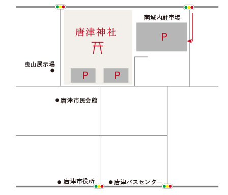 唐津くんちは唐津神社周辺で交通規制が実施されますので、ご参拝の際は公共交通機関をご利用ください。 唐津神社駐車場も閉鎖いたします。